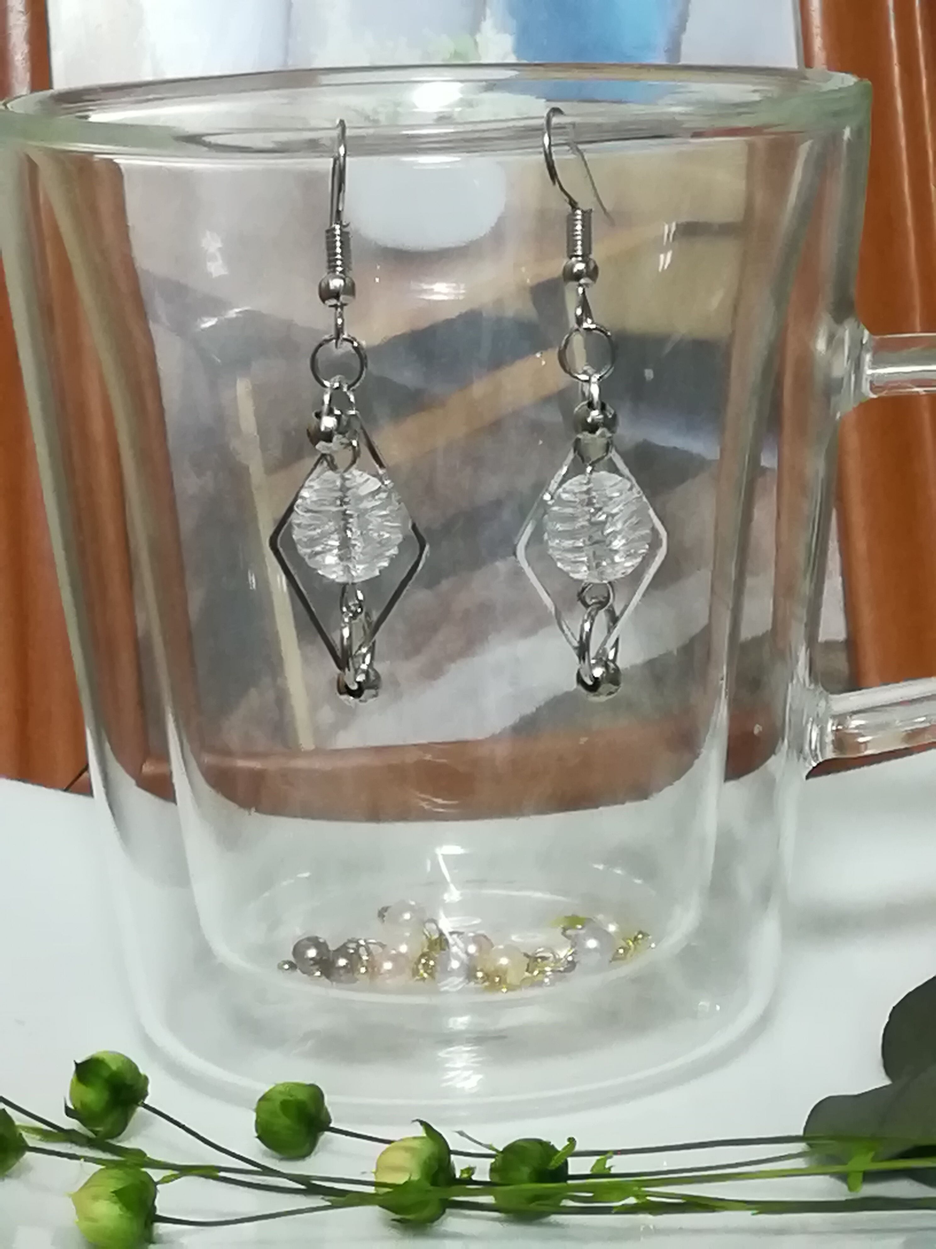 球形に美しい波目が浮き出る大き目ビーズをメインにひし形フレームと大小の丸カンと丸スペーサーでシンプルな中でも動きを感じさせてくれるピアスです。