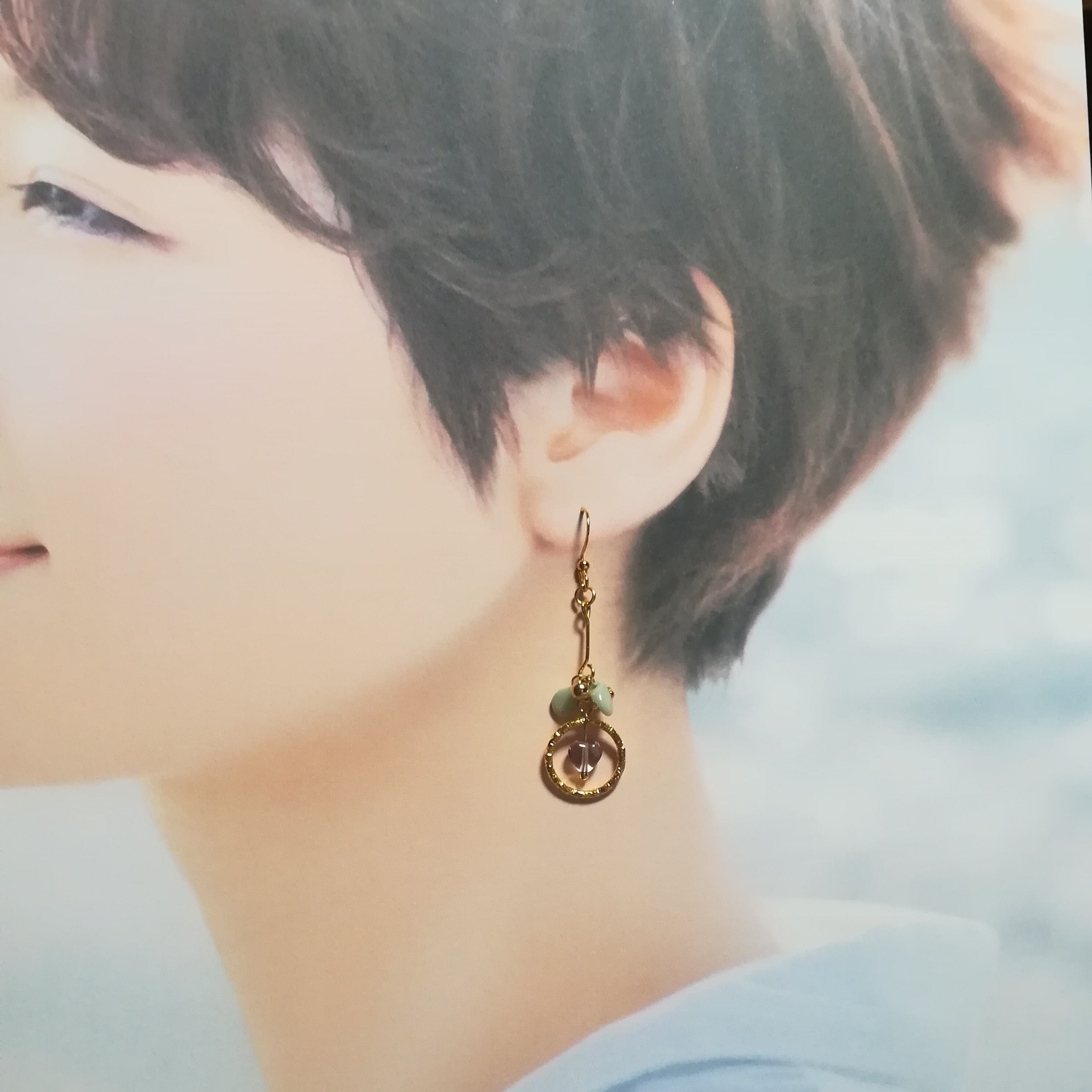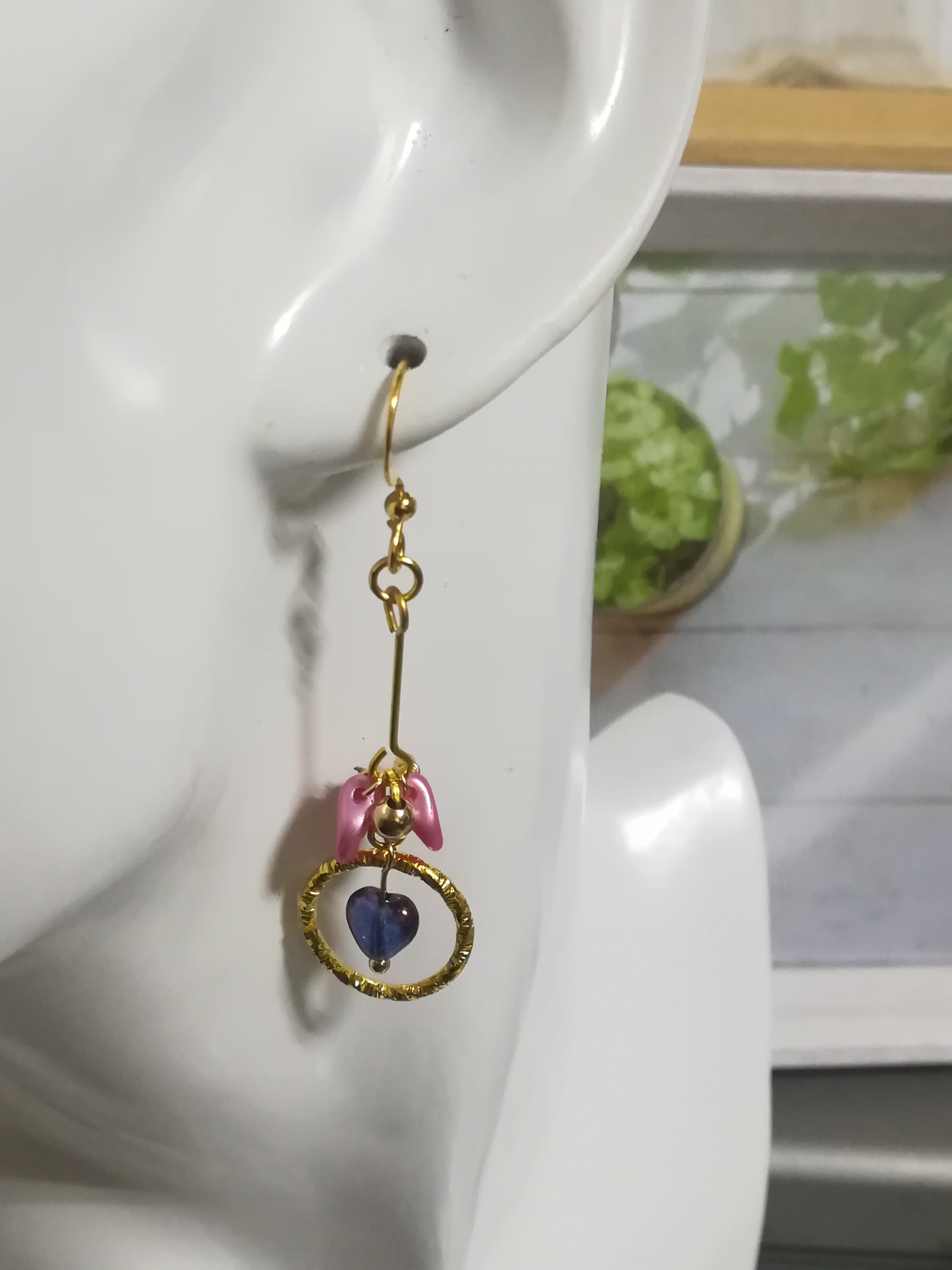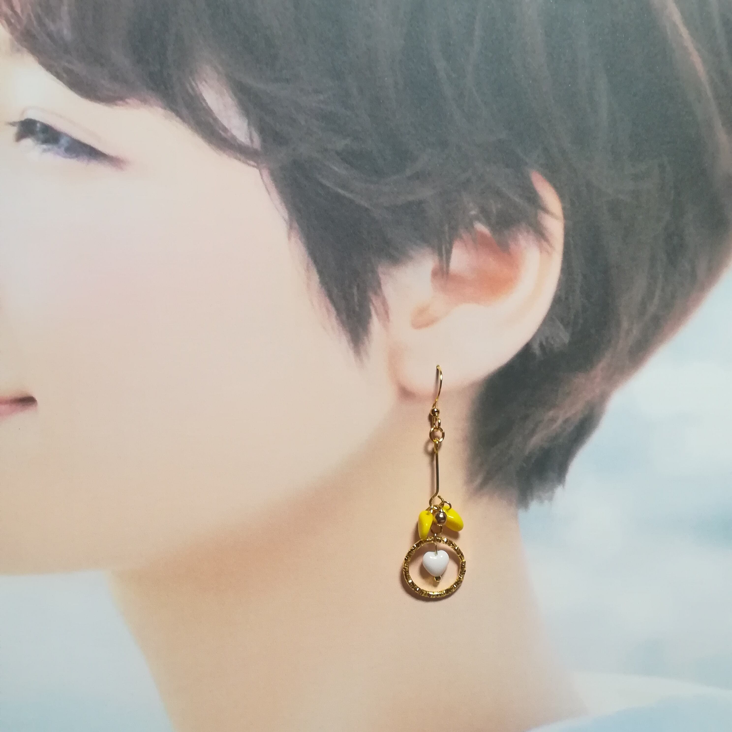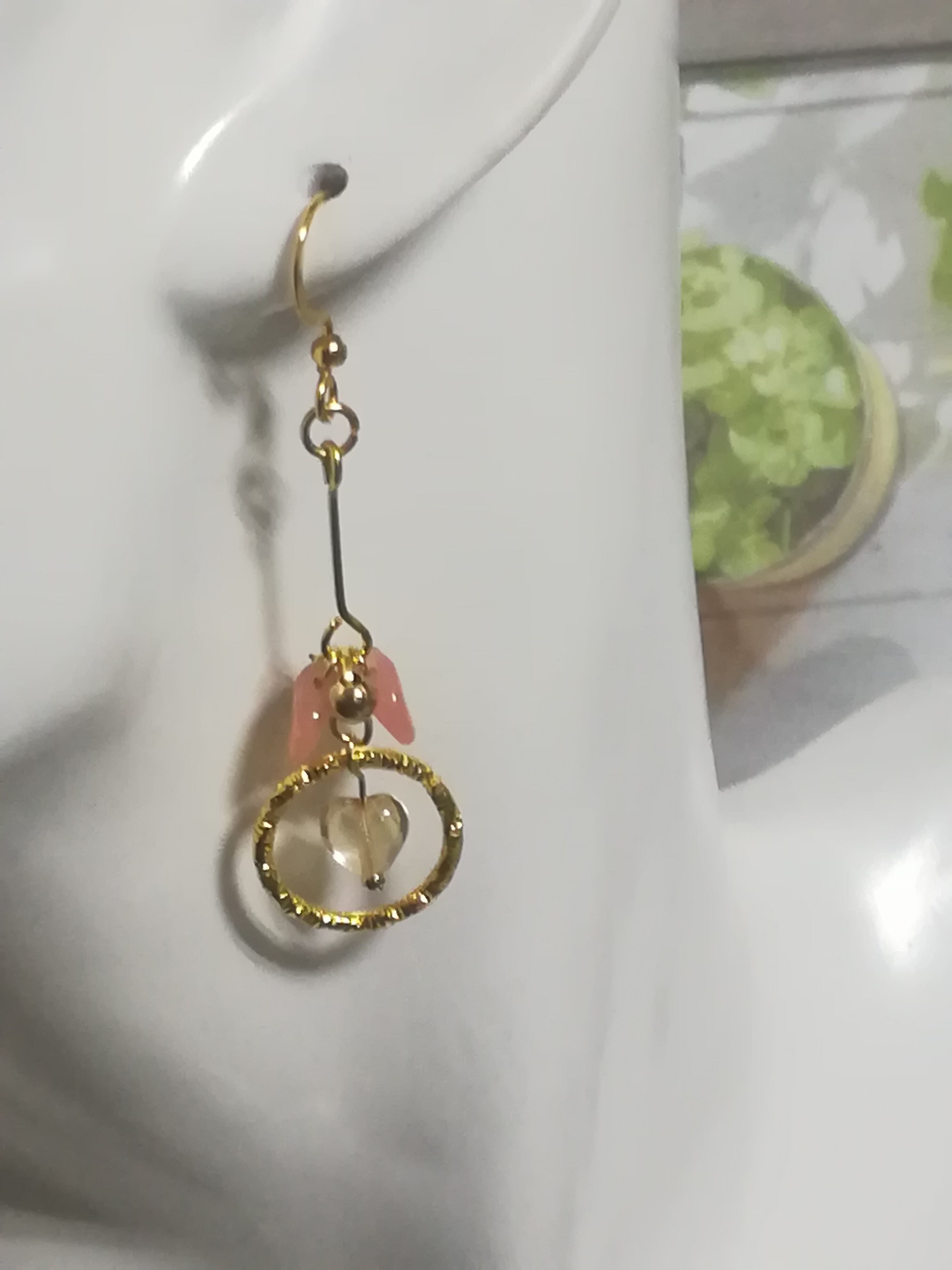 チェコビーズの小さなハートを、同じくチェコビーズの平たい雫ビーズを羽に、ゴールドの丸スペーサーを頭に見立てたエンジェルが大切に運んでいる所を表現してみました。派手さは有りませんが、とても幸せを感じる、ほっこりピアスです。ピアスパーツとモチーフを繋ぐ丸カンは2つ共、サージカルステンレス製で金属アレルギー反応品です。しかし、全ての金属アレルギー対応品ではありませんので、異常を感じましたらご使用を中止し、医療機関でのご受診をお願い致します。