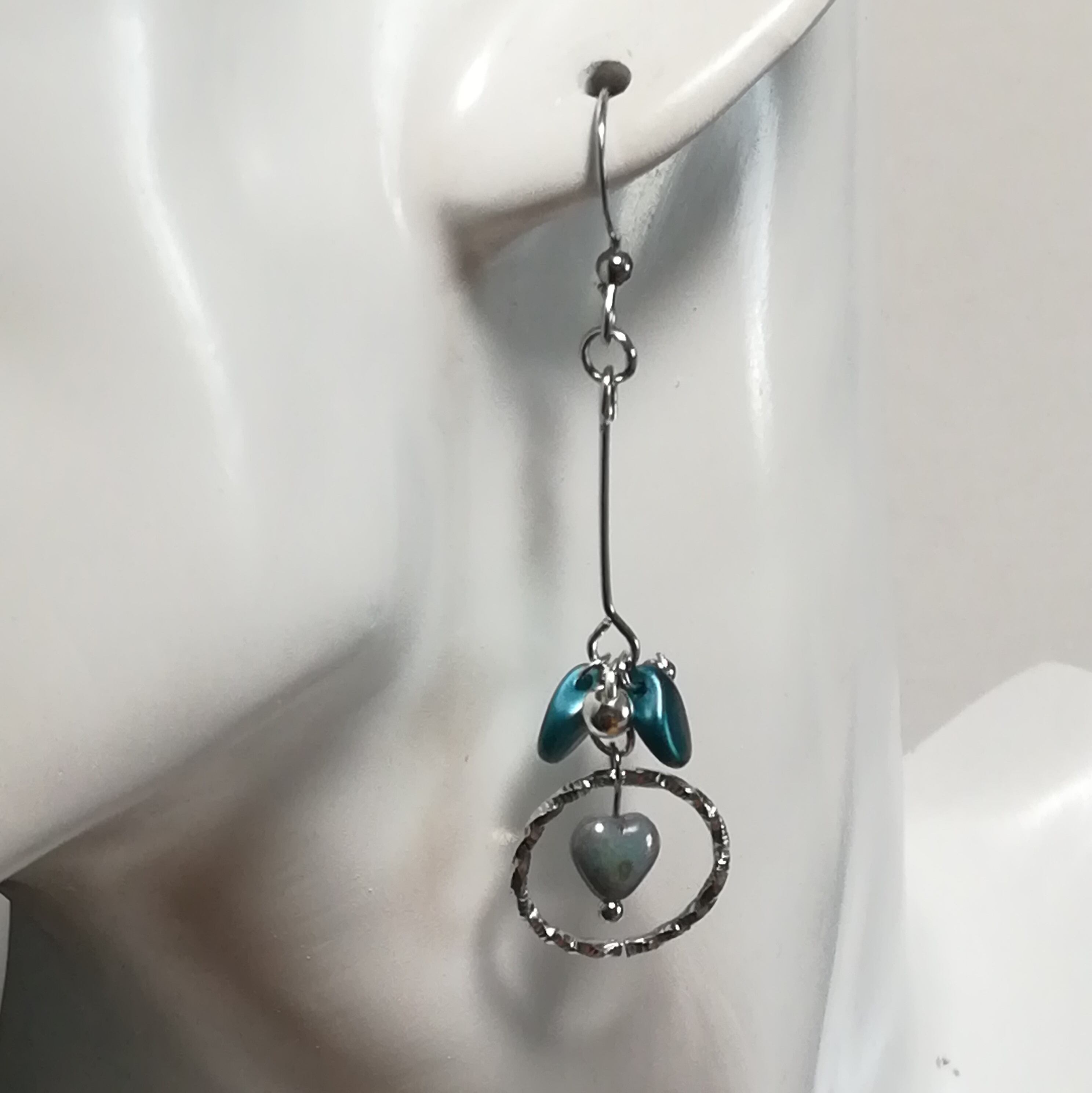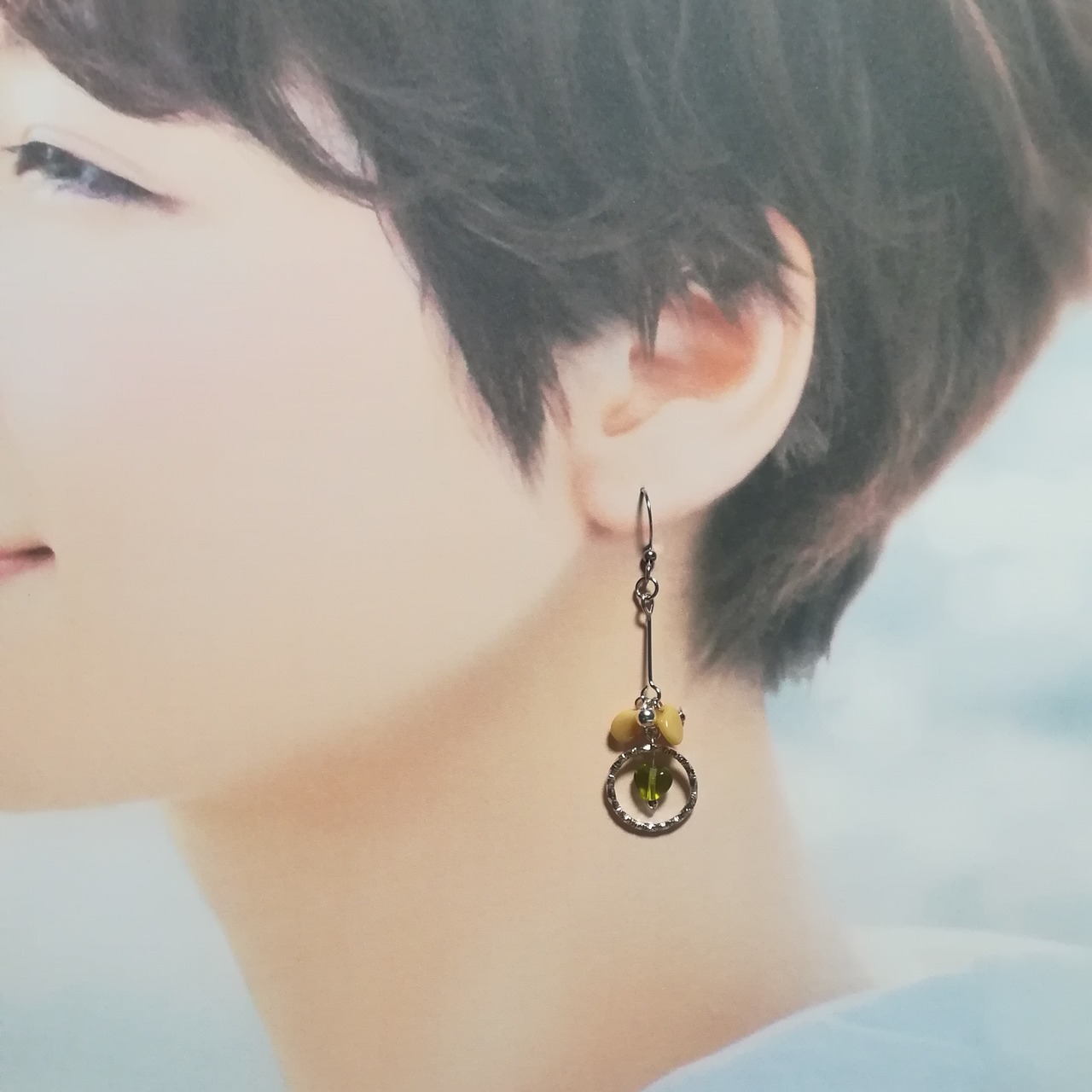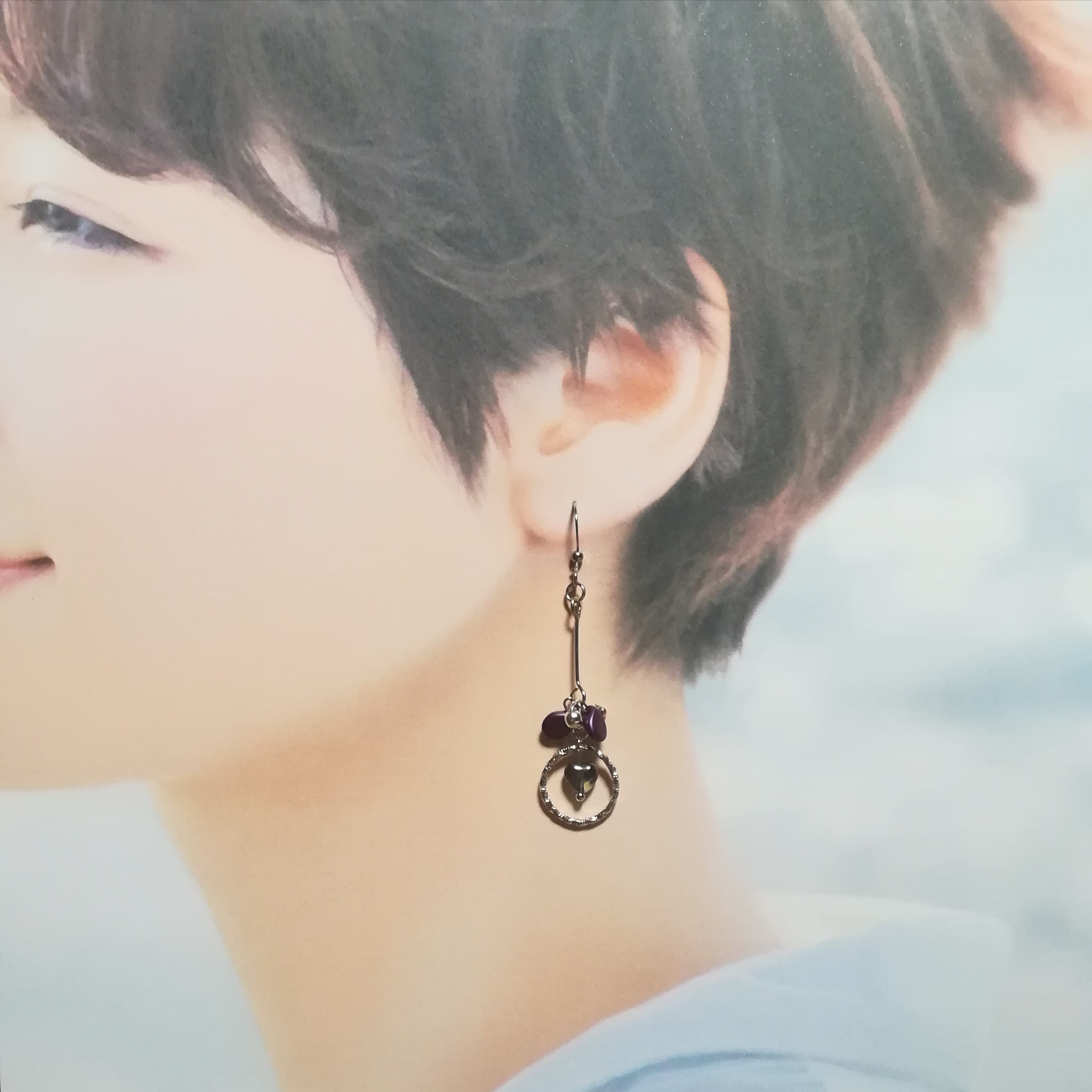 チェコビーズの小さなハートを、同じくチェコビーズの平たい雫ビーズを羽に、シルバーの丸スペーサーを頭に見立てたエンジェルが大切に運んでいる所を表現してみました。エンジェルハート ピアスのゴールドよりも、柔らかな輝きでちょっとクールにスッキリとした印象にしてくれますよ。ピアスパーツとモチーフを繋ぐ丸カンはサージカルステンレス製で金属アレルギー対応品となっていますが、全ての金属アレルギー対応品では有りません。異常を感じましたらご使用を中止し、医療機関でのご受診をお願い致します。