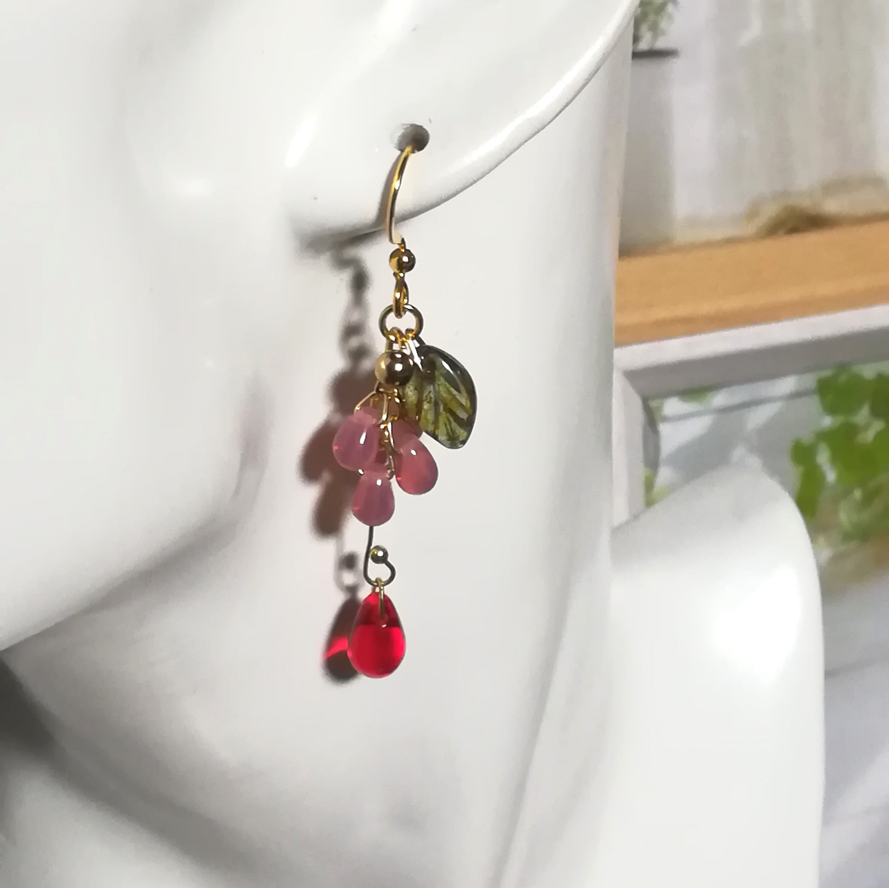 チェコビーズの小さ目ドロップビーズで小さな実のじゃらじゃら感を、大き目ドロップビーズで完熟度の違う見事に垂れた収穫待ちの実を表現してみました。夏の果実ピアスです。ピアスパーツとモチーフを繋ぐ丸カンはサージカルステンレス製で金属アレルギー対応品ですが、全ての金属アレルギーの対応品では有りませんので、異常を感じましたらご使用を中止し医療機関でのご受診をお願い致します。