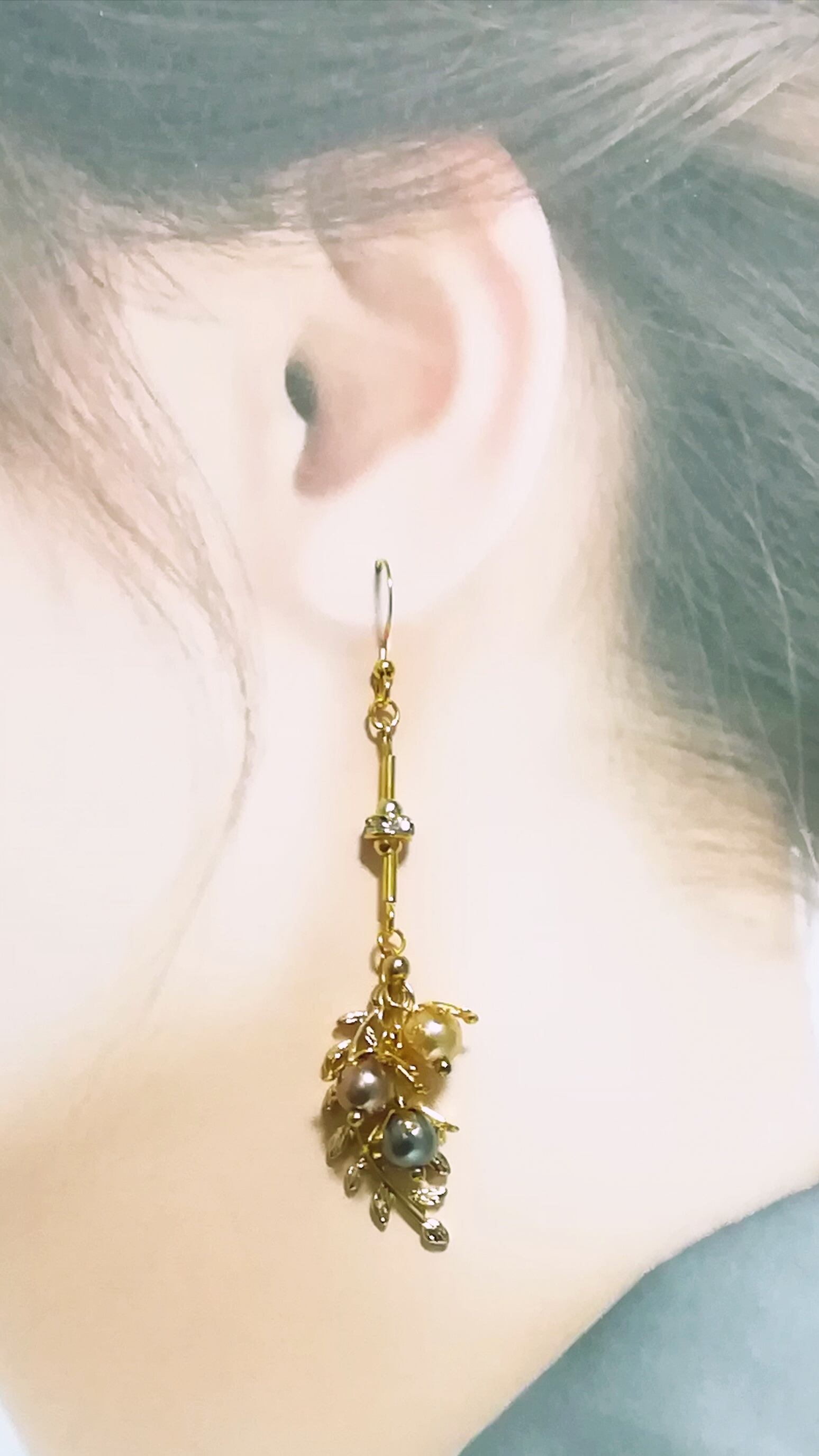 小枝のメタルパーツの上にメタル花座に座った小粒な艶有りカラーパールビーズを3粒置いて、風や頭や身体の動きによって、カチャカチャ,っと音をたてて、いかにも楽しくおしゃべりしたり笑ったりしている様な賑やかで、それでいて小さ目なので派手にならず、可愛くも、大人っぽくも、しっくりと全体の雰囲気をまとめてくれる便利なピアスです。