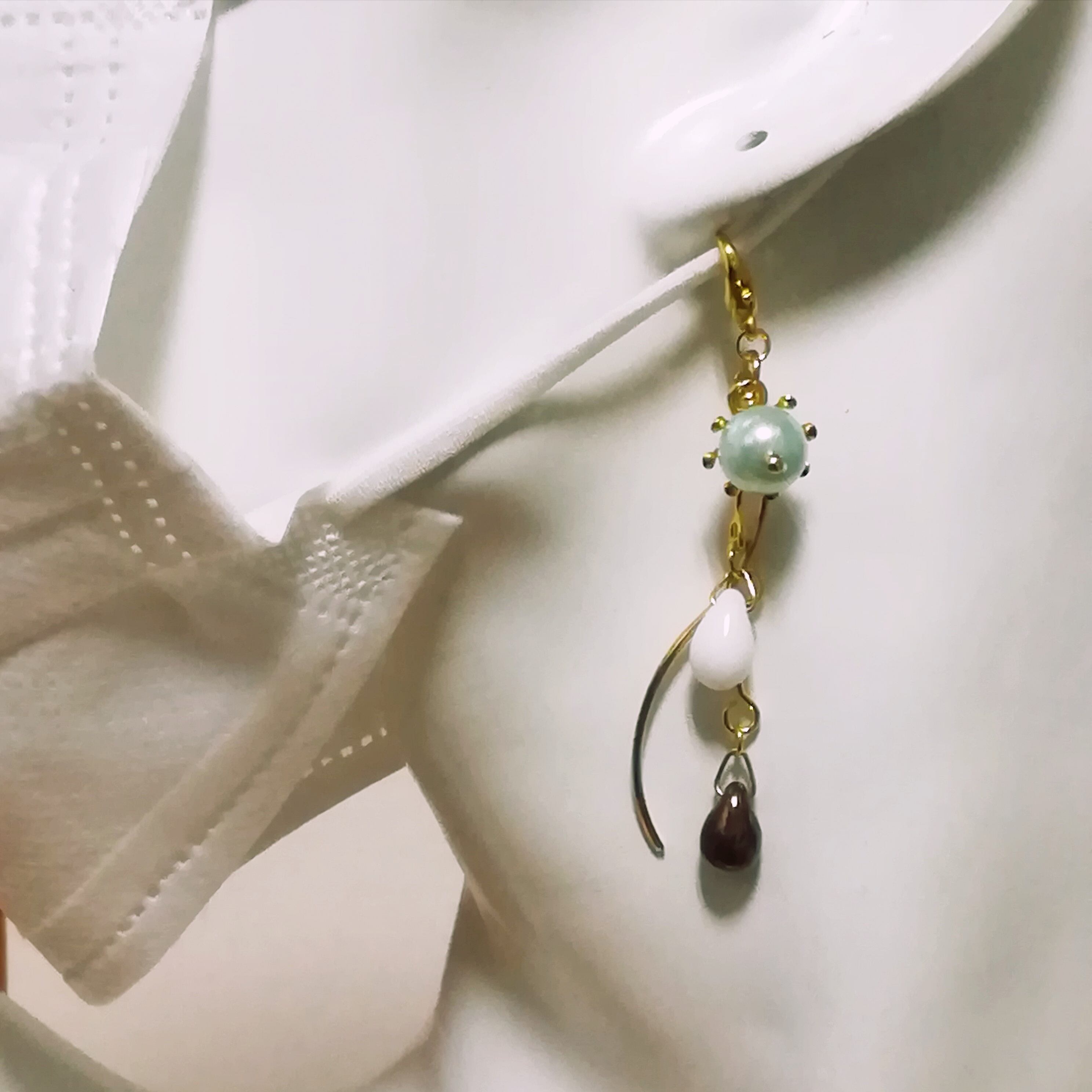 メタル花座に座らせた艶有りカラーパールビーズのお花が、風に甘い香りを乗せようと香りの塊を落としていますよ。チェコビーズの深い色の雫ビーズも素敵。マスクチャーム&ペンダントトップ&ストラップの3wayとして便利にお使い頂けます。ストラップ付です。