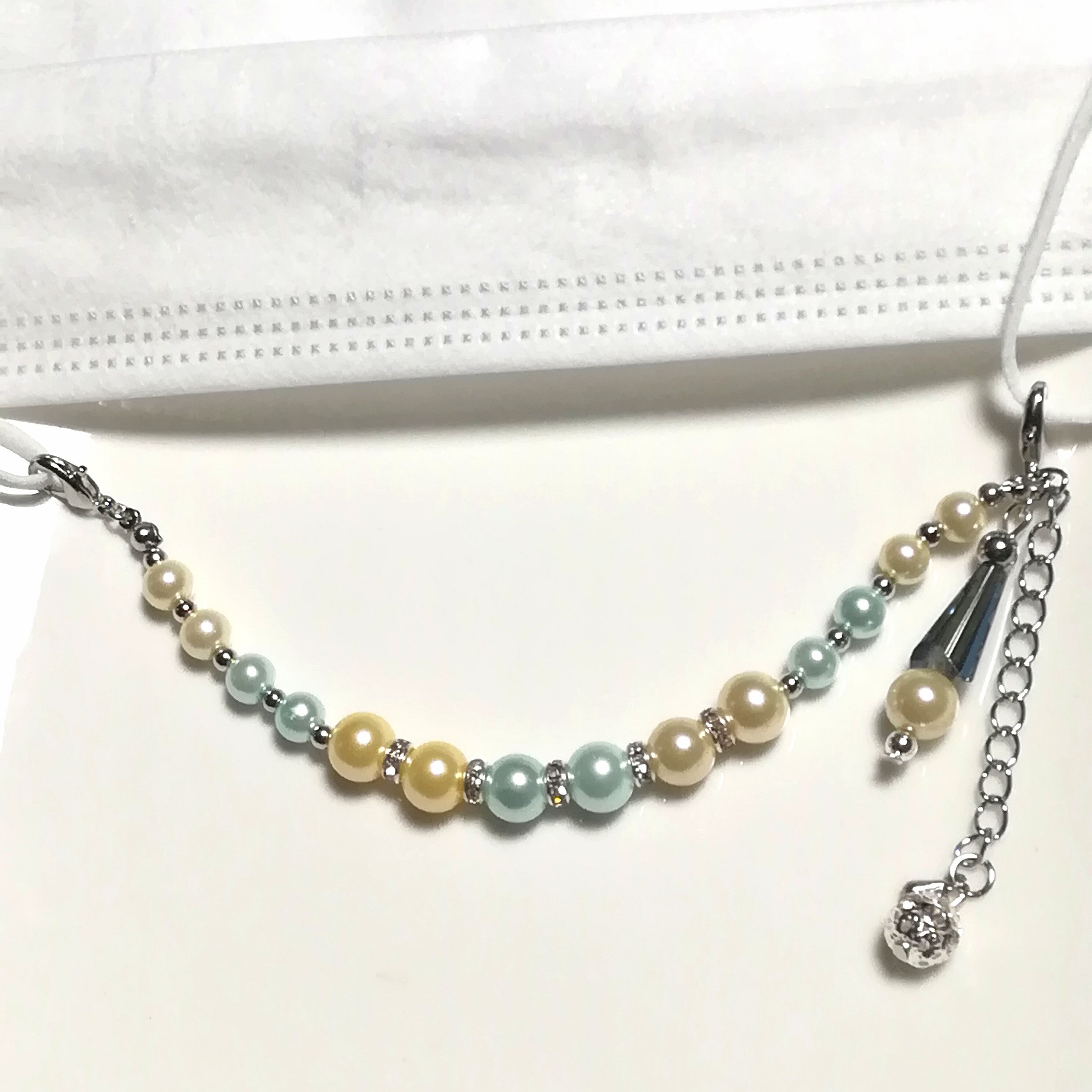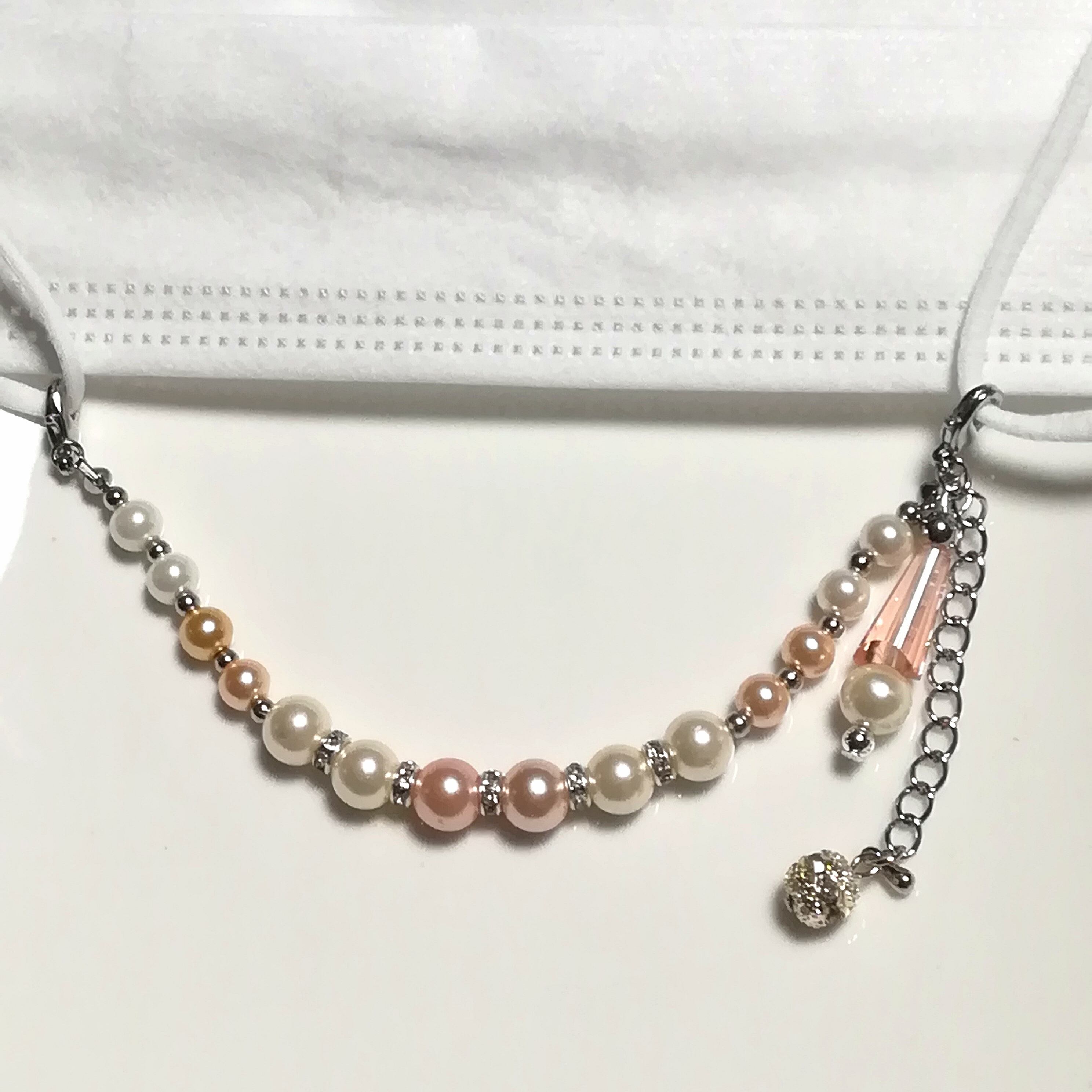 パールビーズとロンデルの3wayアクセサリーです。今回は金具がシルバーカラー仕様で、派手さは有りませんが、若さを感じる明るい雰囲気になりました。先ず、マスクの左右のゴムに両端のカニ環を取り付けて、頭からかぶって頂いて、耳が痛くならないマスクフック(後から見るとヘアアクセサリーに見えます)として。次に、アジャスターが付いていますので、もう一方のカニ環を取り付けてチャーム付きのブレスレットに。最後に、アジャスターの付いた方のカニ環の下の丸環に、もう一方のカニ環を取り付けてチャーム付きのストラップ(ストラップはお付けします)としてバッグチャーム等にもお使い頂けます。