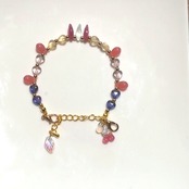 チェコビーズの深い色のハートと葉と雫の可愛らしいビーズをゴールドカラー金具仕様で連ねて、両端に丸環とカニ環を取り付けて、片方の丸環に、チャームとアジャスターを取り付けました。先ず、両端のカニ環を、左右のマスクのゴムに取り付けて、頭からかぶって耳の痛くならないマスクフックとして。次に、手首に巻いてアジャスターにもう一方のカニ環を取り付けてブレスレットとして。最後に、チャームとアジャスターの付いた丸環に、もう一方のカニ環を取り付けてストラップ(ストラップパーツはお付けします)としての、繊細で可愛い3wayをお楽しみ下さい。