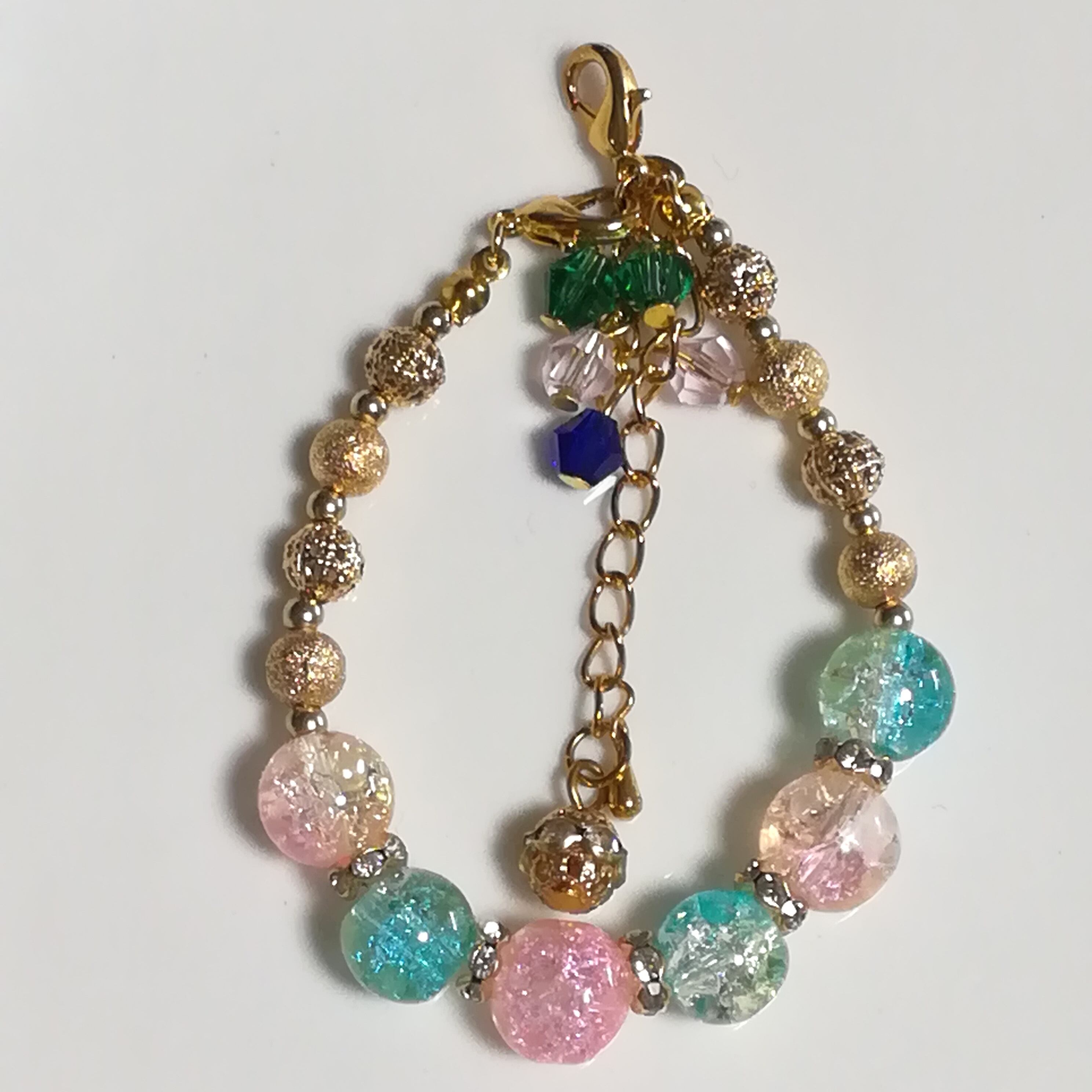 クラッシュガラスビーズとメタルビーズのキラキラ輝く、3wayアクセサリーです。マスクの左右のゴムに両サイドに付いているカニ環を取り付けて、頭からかぶっていただき、耳の痛くならない、後ろから見るとヘアアクセサリーに見えるマスクフックとして。手首に巻いてアジャスターにもう一方のカニ環を取り付けてブレスレットとして。アジャスターとチャームの付いているカニ環に付いている丸環にもう一方のカニ環を取り付けてストラップやバッグチャームとして(ストラップパーツは、お付け致します。)。太陽の輝きを優しく受け止めてキラキラ輝く3wayアクセサリーです。