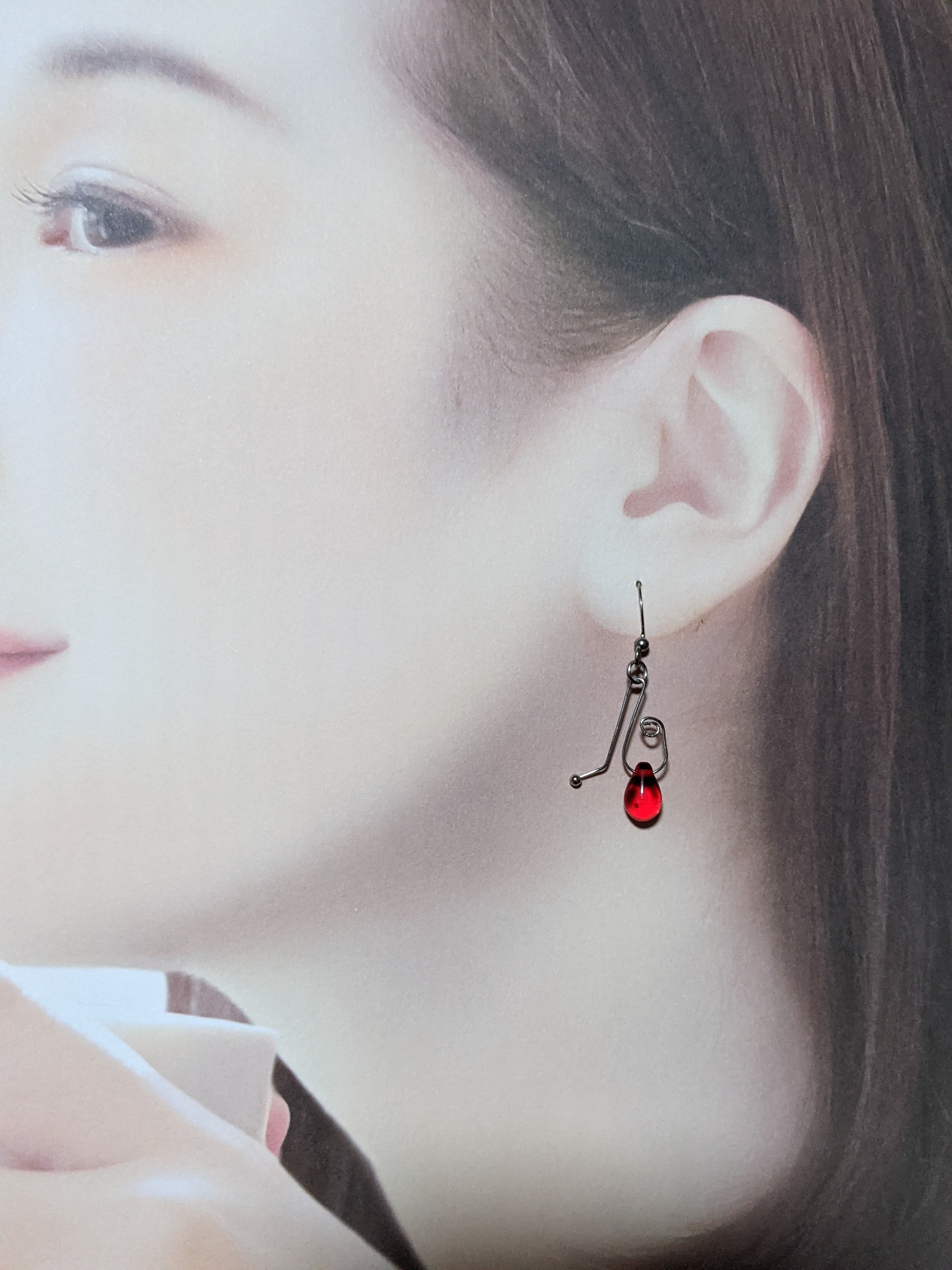 シンプルですがアートスティックなフックを作る途中で大粒雫チェコビーズを通してフックごと揺れて趣のあるファッションポイントとして、楽しんで頂けます。別売りの、サージカルステンレス製4ミリ丸カン付きのフック式ピアスや、バネ式イヤリングパーツにフックを通してお着けください。